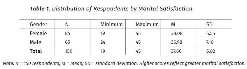 The study utilized the Norton Quality of Marriage Index, consisting of 6 statements rated on a 7-point Likert scale, to assess marital satisfaction. A higher score indicates greater marital satisfaction. The overall average score for the respondents was 37.6, with a standard deviation of 6.82. There was a slight difference in marital satisfaction scores based on gender, with female participants averaging 38.08 and male participants averaging 36.89. (Table 1).