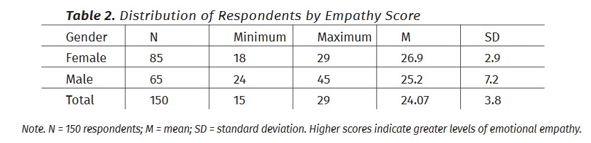 The average score for the respondents is 20.1, with females averaging 20.61 and males averaging 19.51. In this study, the average score for respondents was 24.07, with a standard deviation of 3.8. Female respondents had an average score of 26.9 (SD=2.9), while male respondents had an average score of 25.2 (SD=7.2) (Table 2). The results suggest that female respondents exhibit higher empathy levels compared to male respondents. This indicates a potential gender difference in emotional empathy, with females scoring higher on average. The overall average score of the sample population reflects a moderate level of empathy.