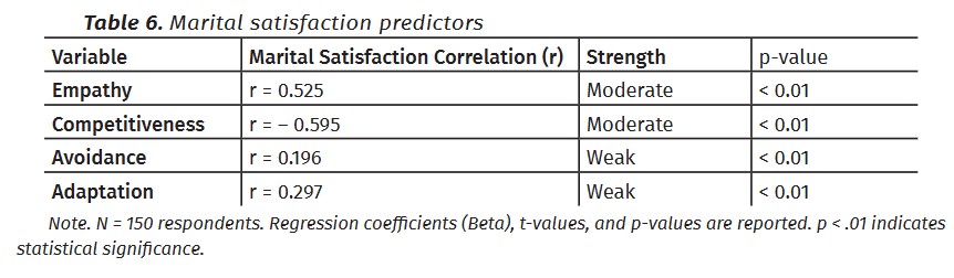 A regression analysis identified Empathy and Competitiveness as significant predictors of marital satisfaction, explaining 46% of its variability (R=0.46, p<0.01R = 0.46, p < 0.01R=0.46, p<0.01). (Table 6)