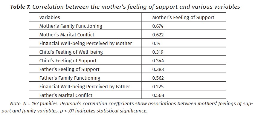 Correlation Analysis highlights several positive correlations between the mother’s feeling of support and various family dynamics variables (Table 7):